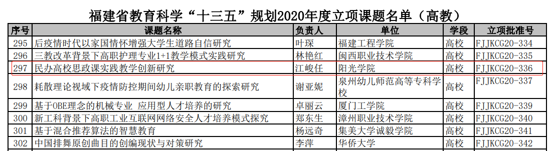 近日,根据《省教育科学规划2020年度课题立项结果公布通知》(闽教科规〔2020〕15号文),我院江峻任副教授主持的项目获批立项。具体信息如下: