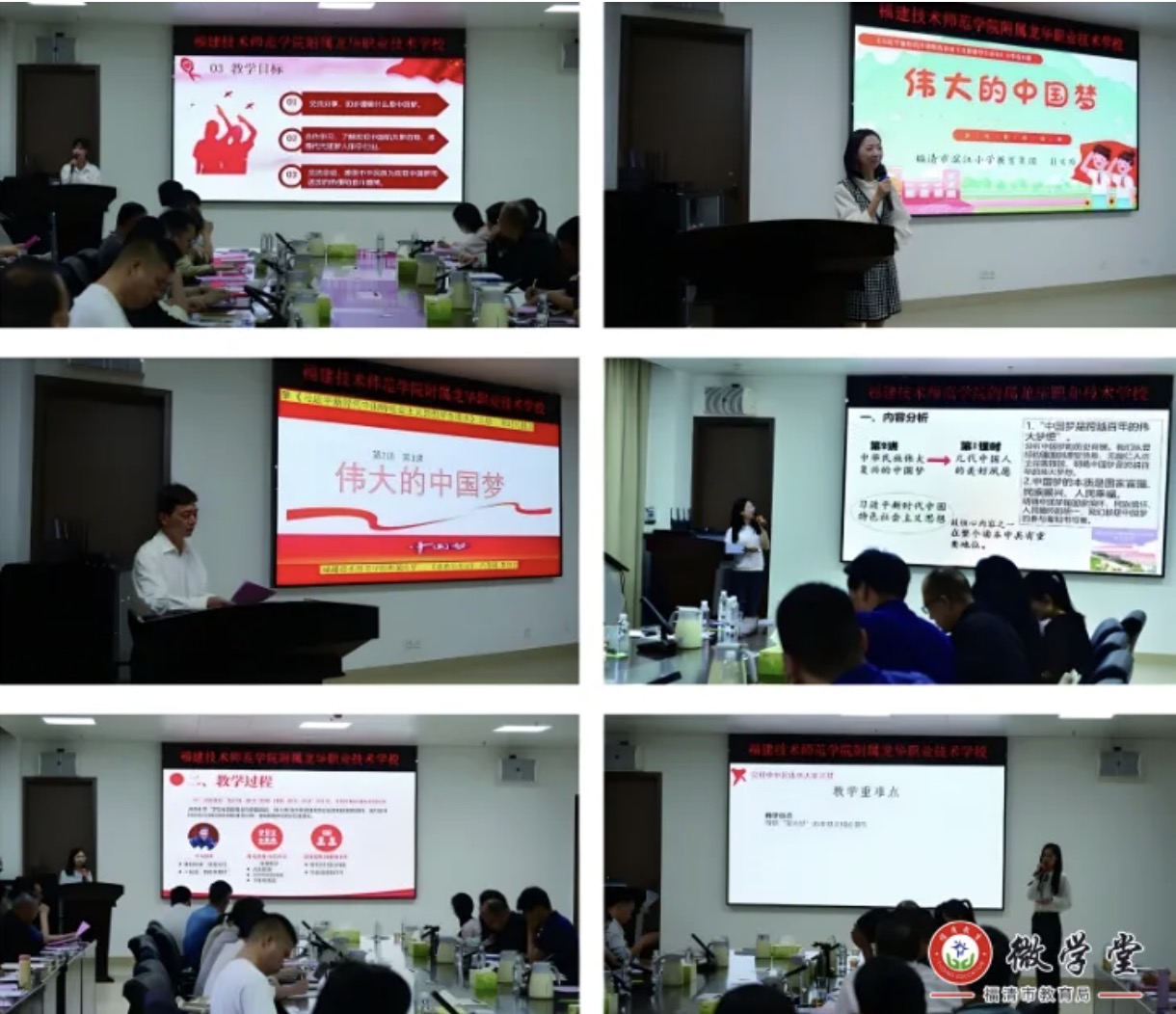 在学段分享阶段,六所院校思政课教师代表依次上台,进行了精彩的说课示范。福清市滨江初级中学教师陈琳从“回望历史”“喜看今朝”“畅想未来”的脉络展开、福清市滨江小学教师翁文玲则以“寻梦、追梦、圆梦”为主线讲述;福建技术师范学院附属小学教师陈文娟创新设计了“畅谈希望,理解中国梦”环节,福建技术师范学院附属中学教师李传武则巧妙融入了“缅怀先辈,感悟百年梦”“古今对比,领悟中国梦”等活动,帮助学生理解中国梦与每个人的紧密联系;福清一中教师曾艺洋以“关税战”为切入点,福建技术师范学院附属龙华职业技术学校教师叶文倩则将职业技能与思政教育深度融合,以增强学生的专业认同感和职业责任感。